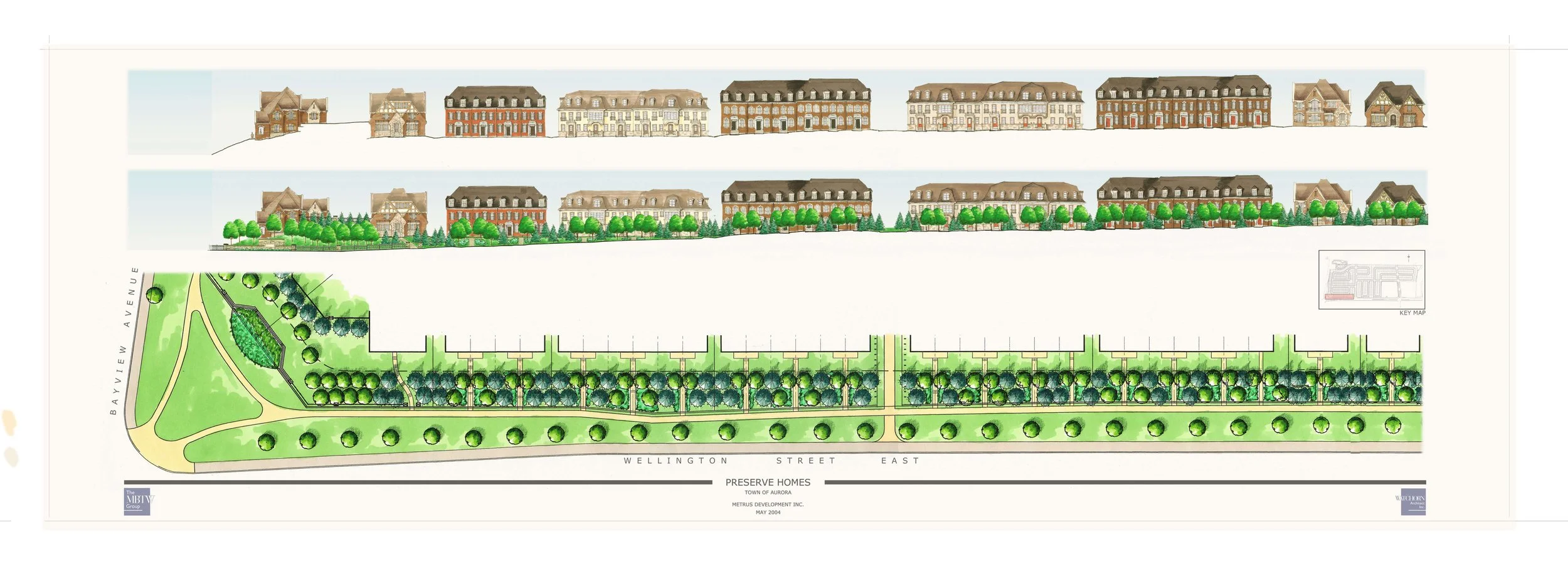 The MBTW Group was retained to provide urban design and landscape design services for various aspects of the development, including the entry feature, Wellington Street streetscape and buffer zones, a stormwater management pond, valley land restoration, a roundabout and road center median, as well as fencing and street trees. Today, this community stands as one of Aurora's most desirable neighborhoods to live in.